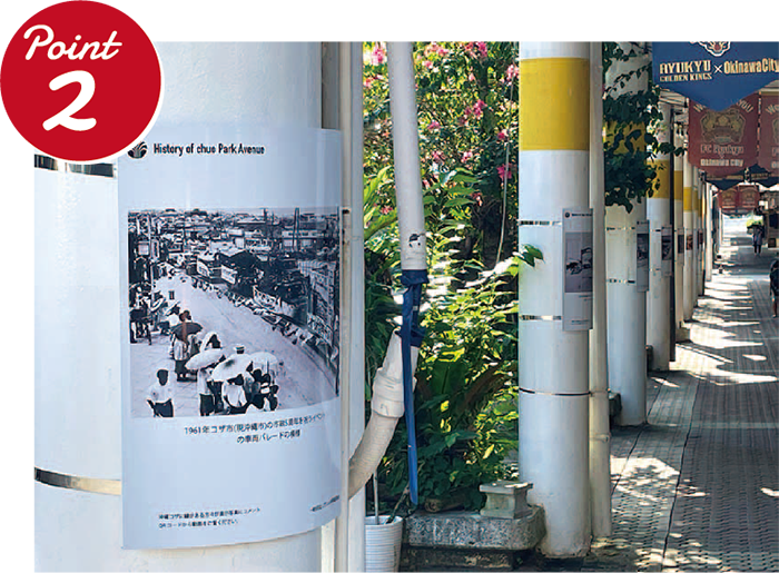 ツアーの出発地であるパークアベニュー商店街の変貌を伝える写真を通りの柱一本一本に展示しています。