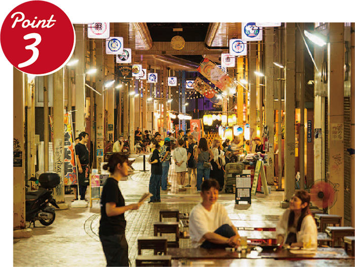 夜の飲食店街は多彩なカルチャーが交差する場所として地元客や観光客に人気。音楽や多国籍料理、そして地元の居酒屋文化が融合しています。